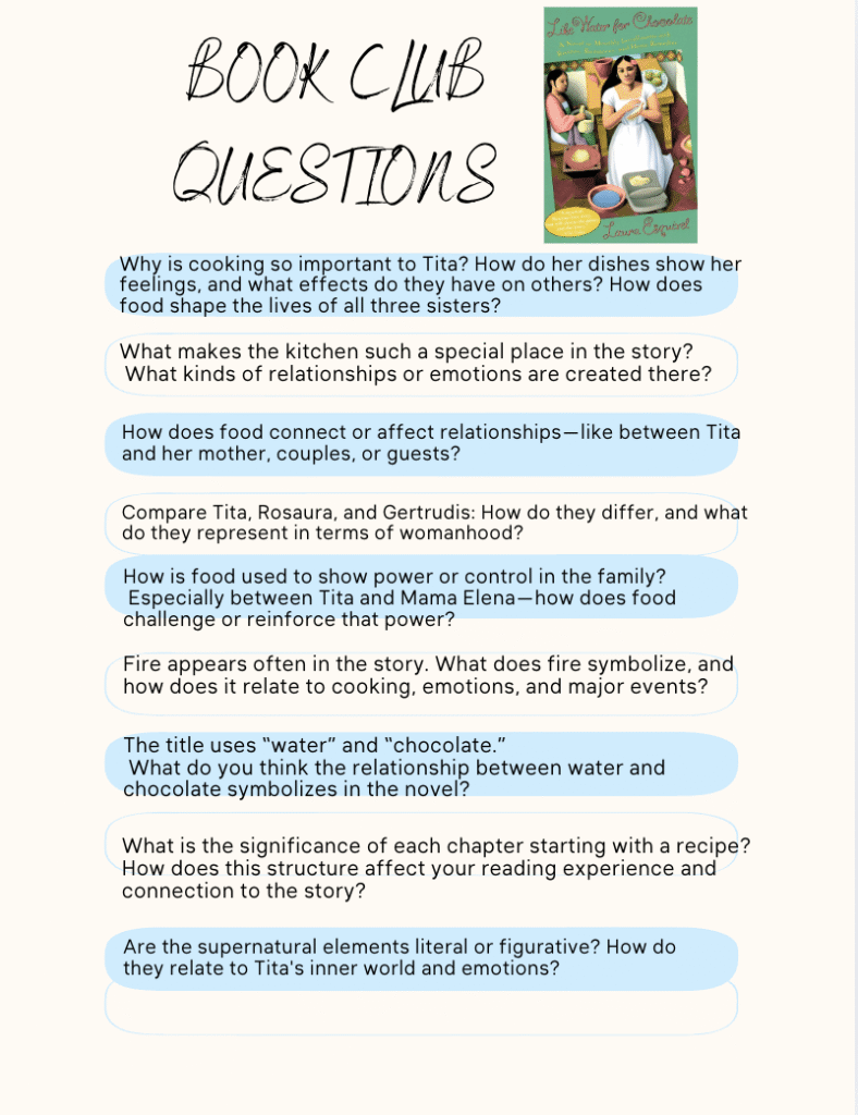 While my guests were coming in, I had warm apple cider and the Like Water for Chocolate ballet on the television. It was mesmerizing and a good thing that I don’t have a TV near my dining room table because we wouldn’t have talked about the book. Here are the questions that we discussed as we ate.